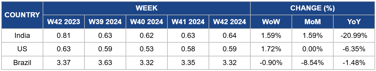 In W42 in the peanut landscape, despite challenging weather conditions, Gujarat's peanut production increased 26% YoY in 2024, rising from 3.34 mmt to 4.21 mmt. This growth was driven by improved productivity and an expansion in the cultivation area. Meanwhile, farmers in Kendrapara and Jajpur districts face a critical shortage of peanut seeds ahead of the sowing season, forcing many to purchase expensive and substandard seeds. In Texas, peanut producers expanded their planted acreage to 236 thousand acres, influenced by higher market prices and potential hurricane damage impacting national supplies. In India, peanut prices rose to USD 0.64/kg in W42, while Brazil's prices decreased to USD 3.32/kg due to currency devaluation and anticipated extreme weather events.