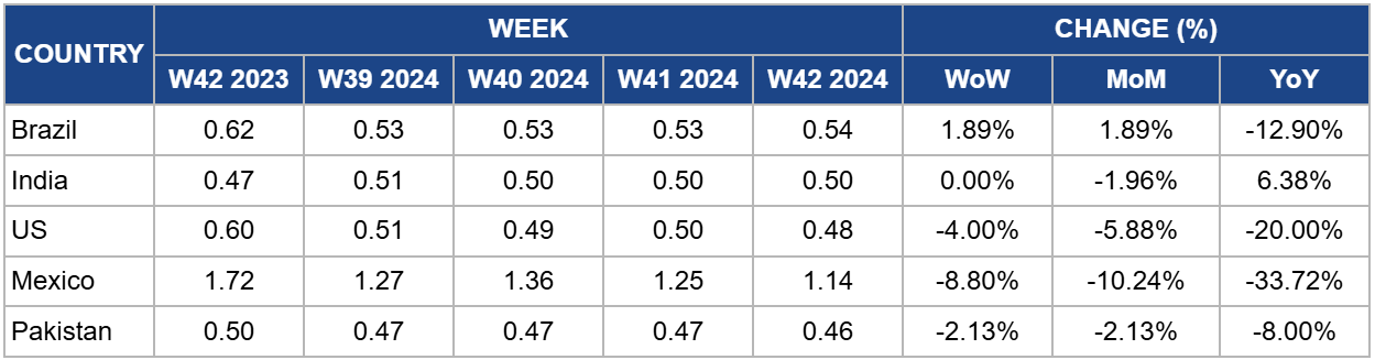 In W42, Pakistan's sugar prices fell to USD 0.46/kg, reflecting a 2.13% decline in both WoW and MoM, along with an annual decrease of 8% from USD 0.50/kg. The Pakistan Sugar Mills Association (PSMA) announced that the sugarcane crushing season will commence on November 21, 2024, ensuring adequate stock despite the government's approval for an additional 500 thousand mt of sugar exports. In addition, a PSMA spokesperson indicated there would be enough surplus sugar to meet over a month of domestic consumption, even post-export. However, the commitment to crushing hinges on the export approval and a forthcoming stock assessment by the Sugar Advisory Board (SAB) on November 1. The PSMA anticipates a surplus of 300 thousand to 500 thousand mt.