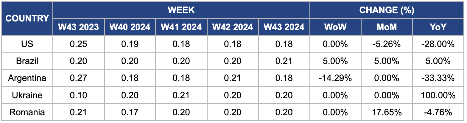 In W43, Romanian maize wholesale prices stood at USD 0.20/kg, marking an increase of 17.65% MoM. Romania, Europe’s second-largest grain exporter, is contending with a notable reduction in corn harvests due to one of the most severe droughts in decades. Nearly 2 million ha of farmland are impacted, with corn output projected to decrease by 10 to 15% for the Oct-24 to Sep-25 season. This anticipated reduction raises concerns about tighter supply and potential market disruptions in the coming months.