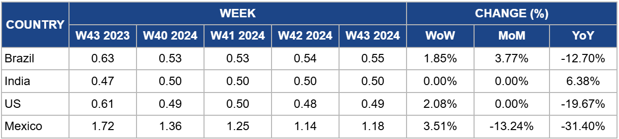 In W43, Brazil's sugar prices rose to USD 0.55/kg, a 1.85% weekly increase, reflecting a 12.70% YoY decline from USD 0.63/kg. Recent trading on international exchanges, notably Intercontinental Exchange Inc (ICE) Futures, showed a downturn in sugar futures due to concerns about reduced stocks and potential harvest damage from late rains in Brazil's Center-South region.