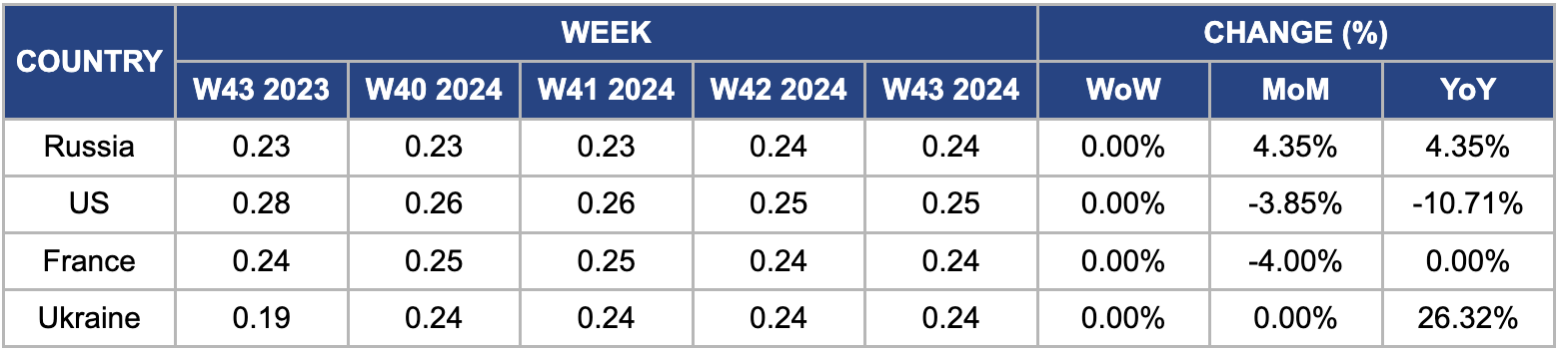 Russian wheat prices remained unchanged week-on-week (WoW) but increased by 4.35% month-on-month (MoM) and YoY, reaching USD 0.24 per kilogram (kg) in W43. This price increase is due to severe drought conditions affecting several regions, particularly Oryol, which has declared a state of emergency. Extreme weather events and earlier frosts have negatively impacted the 2024/25 wheat production forecast, creating challenges for farmers regarding wheat sales and reducing market liquidity. Moreover, concerns regarding winter planting for the 2025/26 crop have risen, prompting the Russian Grain Union (RGU) to advocate for export restrictions. The union urges the agriculture ministry to better reevaluate the export quota methodology to align it with global demand and seasonal potential.