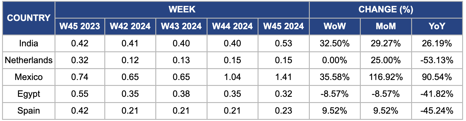In W45, onion prices in the Netherlands held steady WoW at USD 0.15/kg but remained 25% higher MoM from USD 0.12/kg in W42. This season has been marked by challenges, including delayed sowing and heavy rainfall, leading to increased bacterial pressure and quality issues. These factors have introduced market stability and profitability uncertainties for growers, a contrast to previous years when profits were more immediate post-harvest. Demand continues to be robust, with strong interest from the United Kingdom (UK) and a rebound in exports to Africa, Central America, Malaysia, and Israel.