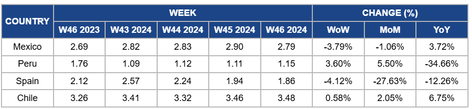 Avocado prices increased in Peru by 3.60% WoW to USD 1.15/kg in W46, with a 5.5% MoM increase. This is due to improved harvest timing and strong European demand, supported by better fruit quality and yield optimization as the industry prepares for the 2024/25 season. Additionally, favorable growing conditions contributed to the price rise. However, there is a significant decrease of 34.66% in YoY prices due to increased competition from Mexican avocados in primary markets like the US and a drop in export volumes by 9% YoY, compounded by concerns over cadmium levels and logistical challenges.