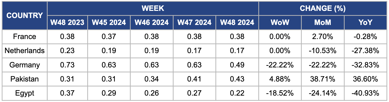 In W48, wholesale potato prices in France remained stable week-on-week (WoW) at USD 0.38/kg but rose by 2.70% month-on-month (MoM). This increase can be due to several factors, including rising production costs, declining yields, and challenges like climate change, wireworms, and chemical bans. These issues led to the loss of 11 thousand hectares of potato cultivation in the latest season. Moreover, heavy rainfall during the harvest season reduced yields and caused large quantities of potatoes to be discarded. With 97% of the harvest completed from a record 177 thousand ha, France's potato supply was further constrained, tightening the market.