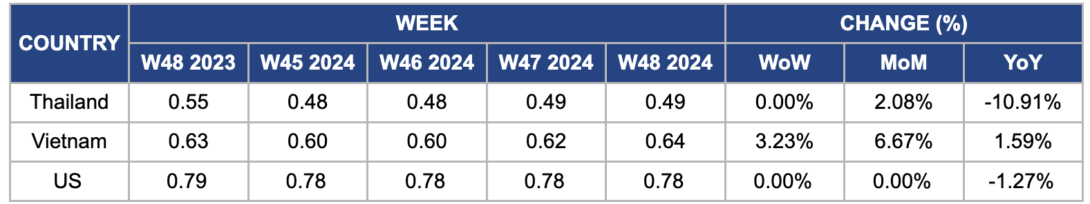 In W48, wholesale prices for Thai rice remained steady week-on-week (WoW) but increased by 2.08% month-on-month (MoM), reaching USD 0.49 per kilogram (kg). Global supply constraints and strong import demand from the Philippines, Indonesia, and other Asian countries drove the price rise. Higher production costs, including elevated fertilizer, fuel, and labor prices, have also added to price pressures. However, the seasonal increase in supply and currency fluctuations helped moderate these upward pressures. On a YoY basis, prices declined by 10.91%, mainly due to the arrival of the 2024/25 marketing year (MY) paddy rice crop, which increased supply and exerted downward pressure on prices. Additionally, the depreciation of the Thai baht has lowered prices in US dollar terms, enhancing the competitiveness of Thai rice in global markets.