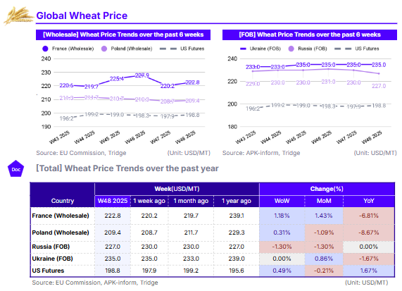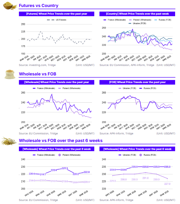 In W48 2025, the market saw a clear contrast between an upward correction in the European Union (EU) and a downward adjustment in Russian prices. France's wholesale price rose 1.18% week-on-week (WoW) to USD 222.8 per metric ton (mt). This strong gain is primarily a market correction following a price dip in W47, supported by the continued brisk pace of planting for the 2026 crop. US Futures also posted a modest 0.49% WoW gain, reaching USD 198.8/mt, finding slight support from strong export demand and Black Sea tensions. Poland's wholesale price edged up slightly by 0.31% WoW to USD 209.4/mt.