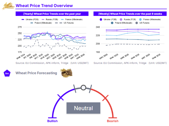In contrast to Europe, the US and Black Sea markets exhibit structural price resilience that defies the overall bearish global trend. US Futures, despite a slight MoM decline of 0.21%, gained 1.67% YoY to USD 198.8/mt. The US market is supported by strong cumulative export demand and ongoing Black Sea tensions, which counteract the pressure from record global production. The Russian FOB price achieved YoY parity at USD 227.0/mt, despite falling 1.30% MoM. This price parity showcases stability and managed supply, successfully offsetting the current severe downward pressure caused by record crop prospects in the Southern Hemisphere. Ukraine's FOB price also shows resilience, with a minimal -1.67% YoY drop, supported by a slight MoM gain of 0.86% and the seasonal expectation of rising importer demand. However, demand in the Ukrainian wheat market has been uncharacteristically slow, which could mean stable prices in the foreseeable future.