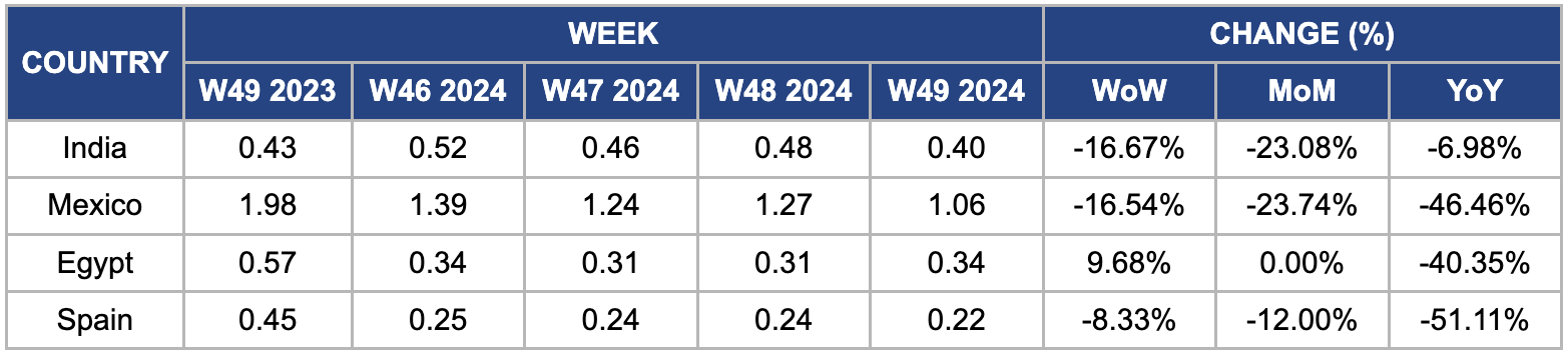 In W49, Mexico's onion prices declined significantly by 16.54% WoW, falling to USD 1.06/kg, representing a 23.74% decrease MoM and a 46.46% drop YoY. This sharp decline is due to several factors, primarily the increase in supply from the new harvest, especially from key production regions like Sinaloa, which has led to a market surplus. As the harvest season peaks, the availability of fresh onions has pushed prices down. Moreover, reduced export demand, due in part to competition from other onion-exporting countries like the Netherlands and India, has contributed to a more excellent domestic supply, further putting downward pressure on prices. Seasonal adjustments in domestic consumption, where demand can fluctuate, also prompted sellers to lower prices to avoid excess stock.