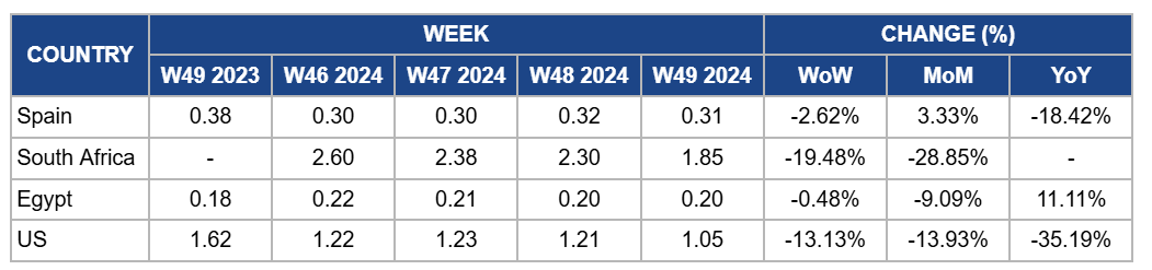 In W49, orange prices in South Africa experienced a sharp decline, dropping by 19.48% WoW to USD 1.85/kg, reflecting a 28.85% MoM decrease. This decline is due to an oversupply in primary markets, mainly Europe, following a sudden surge in orange arrivals in Oct-24 after earlier shipment delays caused by frost, heavy rains, and hurricanes. The oversupply led to intense competition and sharp price reductions, worsened by logistical strikes that hindered efforts to redirect exports to alternative markets like Canada. The reduced export forecast and unpredictable juice market dynamics further contributed to market volatility, adding downward pressure on fresh orange prices.