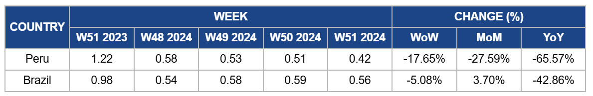 Peru's mango prices fell significantly by 17.65% WoW to USD 0.42 per kilogram (kg) in W51, with a 27.59% month-on-month (MoM) decline and a 65.57% year-on-year (YoY) drop. The price decrease is due to market saturation from overlapping early harvests with Brazilian supply, increasing competition, and price pressures. Smaller fruit sizes, high logistics costs, and customs delays have further contributed to the price drop. Despite these challenges, Peru focuses on diversifying markets and improving packing technologies to remain competitive internationally.