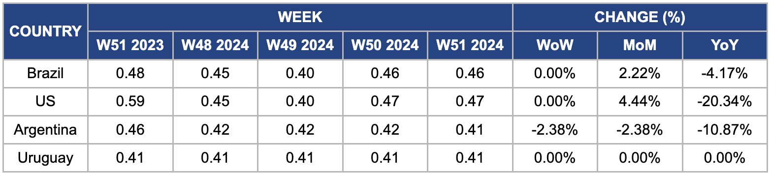 Uruguay's soybean prices remained steady at USD 0.41/kg in W51, supported by several key factors. A strong Uruguayan peso (UYU) helped mitigate the impact of exchange rate fluctuations, contributing to price stability despite global market volatility. Strong international demand, particularly from major buyers like China, played a crucial role in maintaining prices, especially amidst supply concerns from other producing regions. Additionally, carryover inventory from the 2023 harvest acted as a buffer against potential yield declines, ensuring a consistent supply despite unpredictable weather conditions.