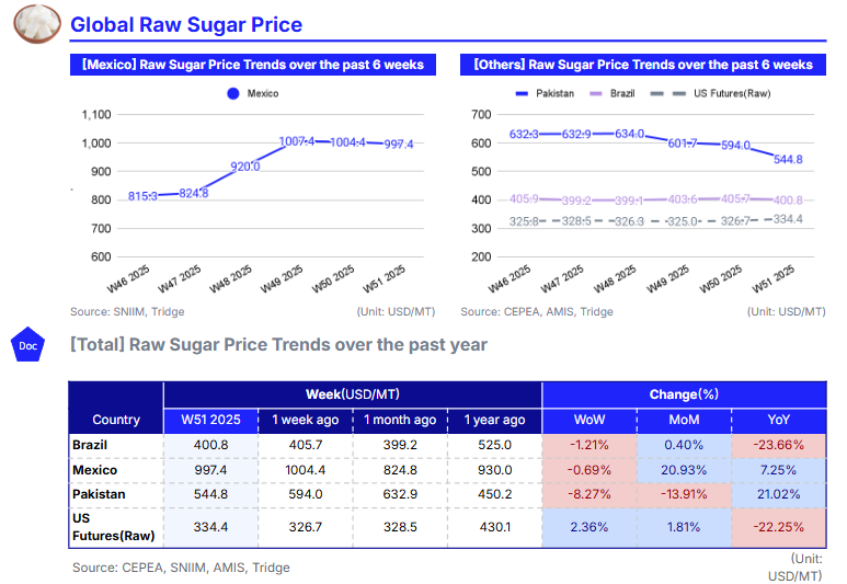 In W51 2025, global sugar markets remained under broad bearish pressure over the past two weeks, driven primarily by currency movements, rising supply, and ample inventories across key producing regions. Brazil’s sugar prices declined by 1.21% week-on-week (WoW) to USD 400.8 per metric ton (mt) and down 23.66% year-on-year (YoY), reflecting the depreciation of the Brazilian real (BRL) to a four-month low, which incentivised exports and increased availability on the global market. This pressure was reinforced by improved short-term agronomic conditions in the Center-South, where Nov-25 cane productivity rose 0.7% YoY to 63.3 mt per hectare (ha) and total recoverable sugar (ATR) improved by 8.6% to 134.3 kg/mt, enhancing production efficiency despite cumulative 2025/26 yields still tracking 4.9% below last season due to earlier climatic and operational disruptions. Mexico’s sugar prices eased 0.69% WoW to USD 997.4/mt amid slowing domestic demand under persistent inflationary pressure and rising concerns over illegal milling activity, which producers warn is distorting market prices and exacerbating oversupply risks despite government support for domestic consumption under Plan Mexico.