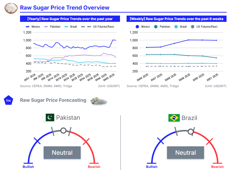 Global sugar prices are likely to maintain a bearish-to-neutral bias in the near term. Brazil’s improving cane quality and stable output prospects should continue to cap international prices, particularly if weather conditions remain favorable. Mexico’s prices are expected to remain elevated but volatile, highly sensitive to enforcement actions and trade policy shifts. Pakistan faces a more balanced outlook, with near-term softness likely to give way to stabilization or mild recovery if crushing delays translate into tighter availability later in the season. Overall, absent a material weather shock in major producing regions, current supply conditions suggest limited upside for global sugar prices into early 2026.