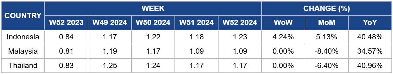 Indonesia's palm oil prices increased to USD 1.23 per kilogram (kg) in W52, marking a 4.24% week-on-week (WoW) rise and a significant 40.48% year-on-year (YoY) increase. This upward trend is driven by tightening inventories despite higher production, exports, and domestic consumption. In Oct-24, palm oil production grew by 9.69% to 4.843 million metric tons (mmt), exports surged by 19.33% to 2.543 mmt, and domestic consumption rose by 4.73% to 2.083 mmt. However, ending stocks decreased by 4.61% to 2.502 mmt, reflecting ongoing supply constraints.