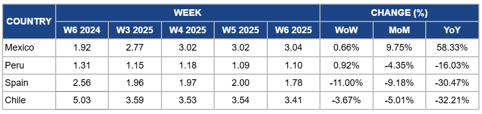 Chilean avocado prices fell by 3.67% WoW to USD 3.41/kg in W6, marking a 5.01% MoM decrease and a 32.21% YoY drop due to increased harvest volumes leading to higher supply in local and export markets. Additionally, competitive pressure from Peru and Mexico, along with shifting demand dynamics in key markets, contributed to the price decline. The significant YoY drop reflects the normalization of supply conditions compared to last year’s shortages, which had previously driven higher prices.