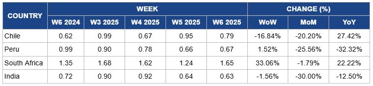 Chile's grape prices fell by 16.84% week-on-week (WoW) to USD 0.79/kg in W6, marking a 20.20% month-on-month (MoM) decrease due to the continued effects of an oversupplied market following peak harvest weeks. Despite the previous price surge in W5, the increased availability of grapes in local and export markets has led to downward pressure on prices. Additionally, logistical challenges and fluctuating demand in key markets like the US and Europe have contributed to the price decline. However, year-on-year (YoY) prices surged by 27.42% due to a more balanced market this season compared to last year, when adverse weather conditions and supply chain disruptions affected production and export volumes. The continued implementation of the Systems Approach and improved fruit quality have also supported higher YoY prices.