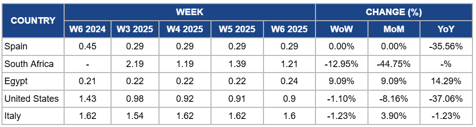In South Africa, orange prices dropped by 12.95% week-on-week (WoW) to USD 1.21/kg in W6, marking a 44.75% MoM decrease due to increased processing volumes absorbing a larger share of production, reducing fresh market demand. Additionally, the expected slight production increase has contributed to higher supply availability, exerting downward pressure on prices. Global supply constraints have also limited export opportunities, further affecting price stability in the domestic market.