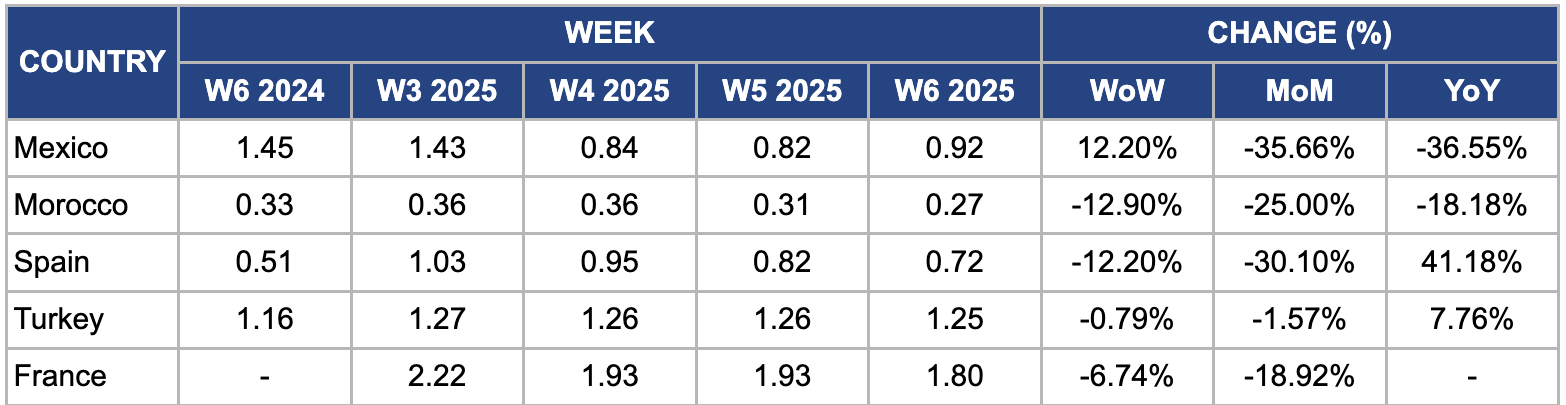 • Mexico’s tomato prices rose WoW following a 25% US tariff but remained lower MoM due to oversupply. Morocco’s prices declined WoW as the impact of Tobamovirus eased, while Spain’s prices fell both WoW and MoM due to increased domestic and imported supply.