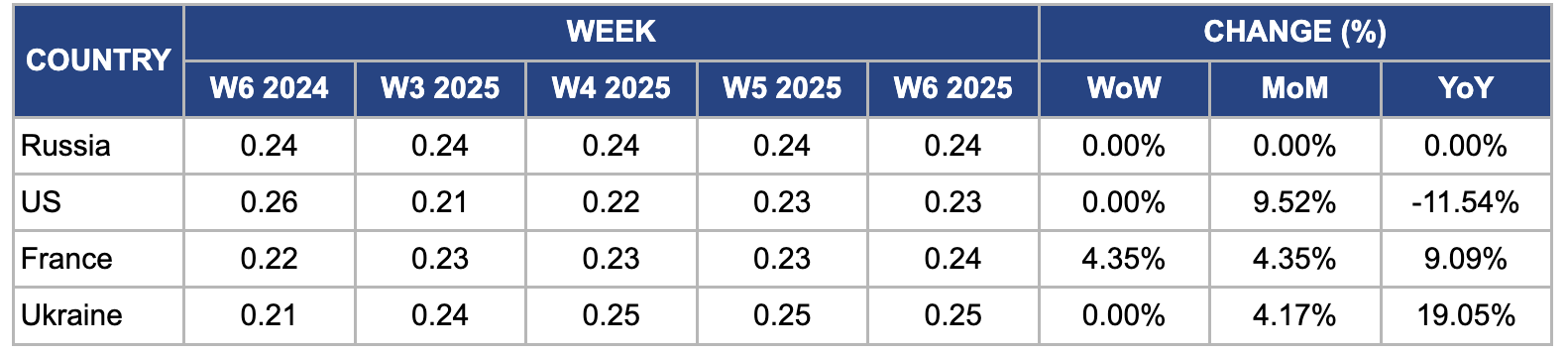 In W6, French wheat prices rose by 4.35% WoW, MoM, and 9.09% YoY to USD 0.24/kg due to a downward revision in 2024/25 production forecasts. France’s wheat export sector experienced challenges from diplomatic tensions with Algeria, reduced Chinese demand, and a poor harvest, leading to a loss of market share to more competitive producers like Russia. The country’s soft wheat harvest has reached its lowest level since the 1980s, while competition from Eastern Europe continues to intensify. Exports to Algeria and China have declined sharply, and sales to Morocco have more than halved, forcing some companies to place staff on unpaid leave. In response, France is working to diversify its export markets by strengthening its presence in the Middle East.