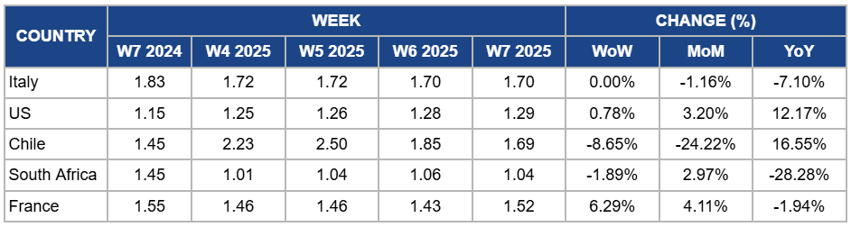 In W7, Chilean apple prices fell by 8.65% WoW to USD 1.69/kg, with a 24.22% MoM drop due to increased supply from the Southern Hemisphere harvest, particularly from Brazil and South Africa, which heightened competition in export markets. Additionally, weaker demand from key importing regions contributed to the downward price trend. However, there is a 16.55% YoY increase in apple prices due to lower carryover stocks from the previous season and improved export opportunities in Asia and North America, where buyers are securing supply ahead of peak demand periods.