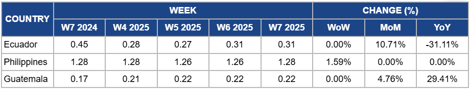 Guatemala's banana prices held steady at USD 0.22/kg in W7, with a 4.76% MoM increase and a 29.41% YoY surge due to sustained export demand from the US and Europe, combined with higher production costs, including rising fertilizer and labor expenses. Stable supply levels continued to support price stability weekly.