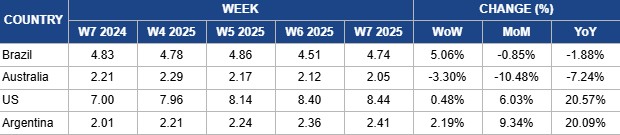 In W7, Brazil's wholesale price for boneless rear beef increased by 5.06% week-on-week (WoW) to USD 4.74/kg. Despite this weekly rise, prices remained 0.85% lower month-on-month (MoM) and 1.88% lower YoY. In the local currency, prices rose 3.85% WoW to BRL 27/kg, reflecting a smaller change due to exchange rate fluctuations. According to Safras and Mercado, the wholesale market is still operating at relatively stable price levels. However, a moderate price increase was expected in the first half of the month, driven by salary inflows that stimulate the replenishment of wholesale and retail stocks. Despite this, demand is expected to be slow in the second half of the month, which could pressure prices downward. The decline has been more pronounced in specific cuts like picanha, alcatra, and striploin, aligning with the trend of consumers opting for more affordable protein options.