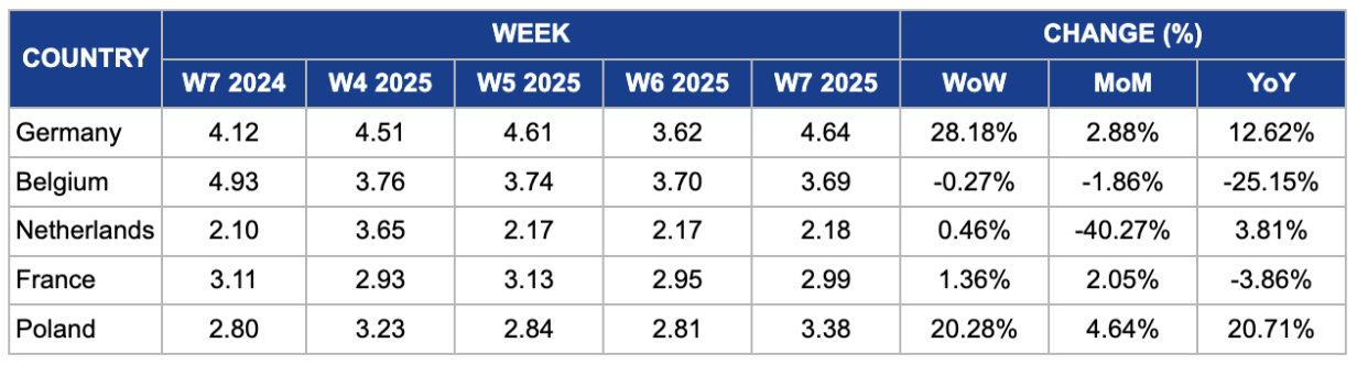 In W7, the price of milk in France reached USD 2.99/kg, showing a slight increase of 1.36% compared to the previous week. The MoM increase of 2.05% also reflects the overall upward trend driven by tighter milk supply across Europe, which has been fueling higher demand and putting upward pressure on prices. However, YoY prices have dropped by 3.86%, primarily as a result of an expansion in France’s milk production throughout 2024. As supply levels rise, this trend is expected to continue, with prices likely to experience further declines in the coming months as the increased production starts to stabilize the market.