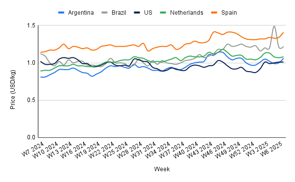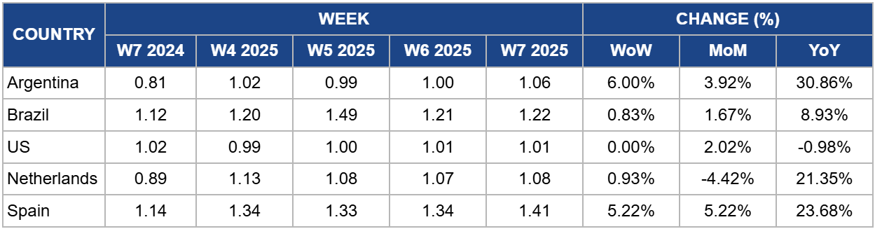 Argentina's soybean oil price increased to USD 1.06 per kilogram (kg) in W7, reflecting a 6% weekly rise and a 30.86% year-on-year (YoY) increase. This price rise coincides with Argentina’s soybean export prices aligning with Brazil's, as Brazil's record harvest pressures the market. While soybean oil remains cheap in South America, US prices are rising, narrowing the price gap. The premium for Argentine soybean oil may disappear if supply and demand dynamics shift, especially as the 2024/25 harvest begins, with many soybean sales yet to be priced. This could impact future soybean oil prices.