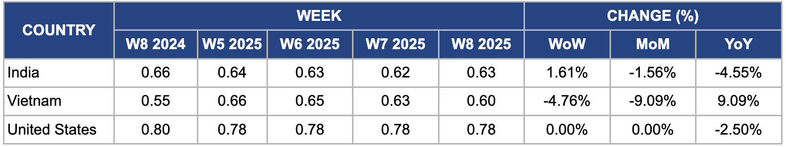 US rice prices fell 2.5% YoY to USD 0.78/kg in W8. The decline is primarily due to higher domestic supply from increased production and record imports. The US rice output for the 2024/25 season rose 2% YoY to 222.1 million hundredweight (cwt), driven by a 12% increase in long-grain rice production, while imports, particularly from Thailand, reached a record 47 million cwt, boosting domestic availability. Weaker export demand amid heightened competition from South American and Asian suppliers pressured prices as buyers opted for cheaper alternatives. Moreover, global rice price softening following large harvests and India's lifting of export restrictions further contributed to the price decline.